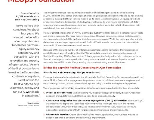 Red Hat Consulting: MLOps Foundation This Red Hat Consulting: MLOps Foundation overview is for enterprise customers seeking to improve their data science capabilities. Read to learn more. FILL THE FORM BELOW